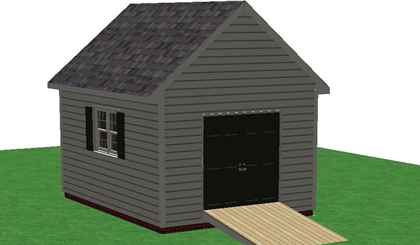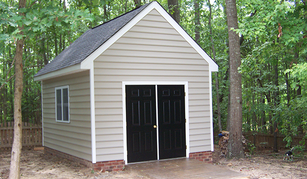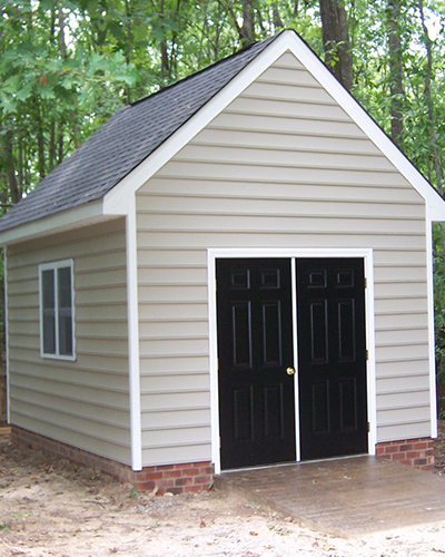 Custom storage building with full brick foundation, 10/12 slope roof, windows, and double door access built in The Highlands subdivision in Chesterfield County.